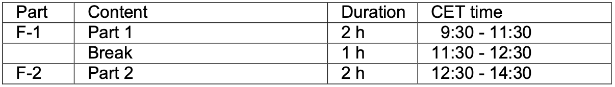 Paper F is split into two parts. The first part is to be completed before the break, with the second part only becoming available after the break. It will not be possible to go back to the first part after the break. Paper F lasts four hours.